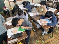 5年生の算数では、「角柱と円柱」の学習に取り組んでいます。5年2組では、展開図から立体づくりの活動をしていました。円柱は、なかなか難しいようでした。図形の学習、特に立体は、実際に作ってみることで理解が深まります。どの辺とどの辺がくっつくのか、長さはどうするのかなど、しっかり考えて取り組んでいました。